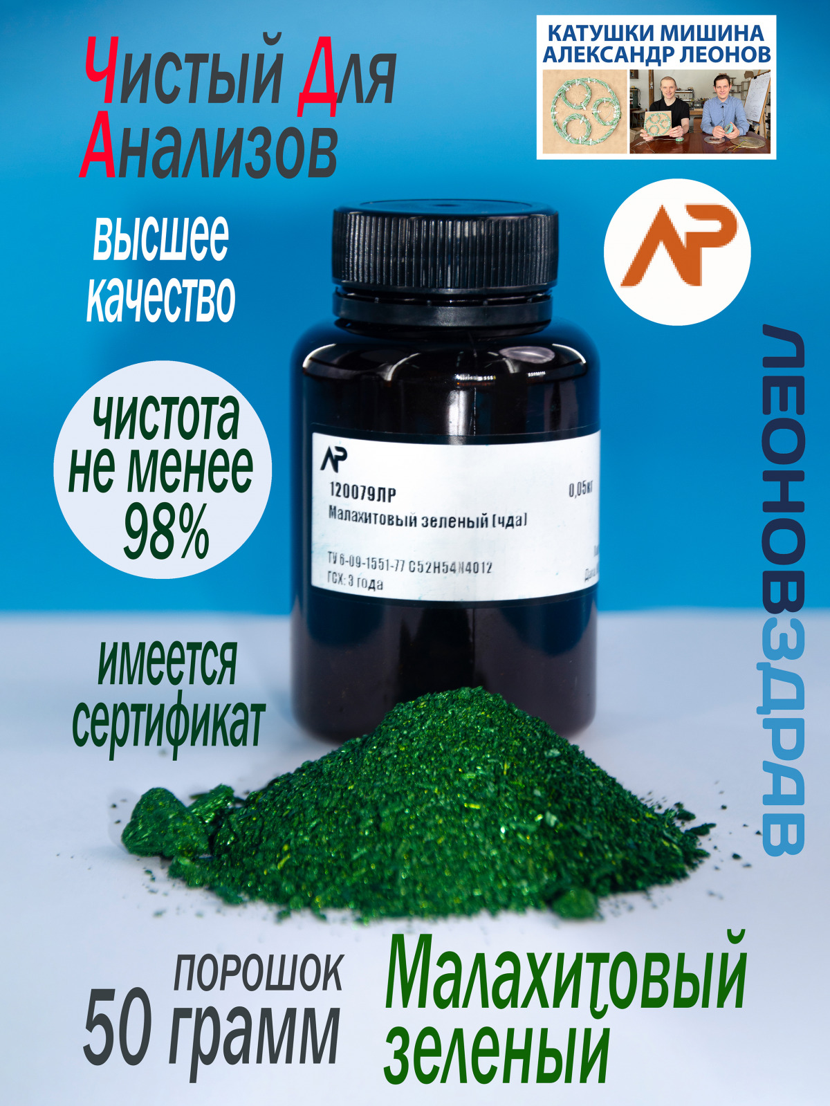 Фракция и внешний вид: Блестящие тёмно-зелёные кристаллы или зелёный кристаллический порошок.